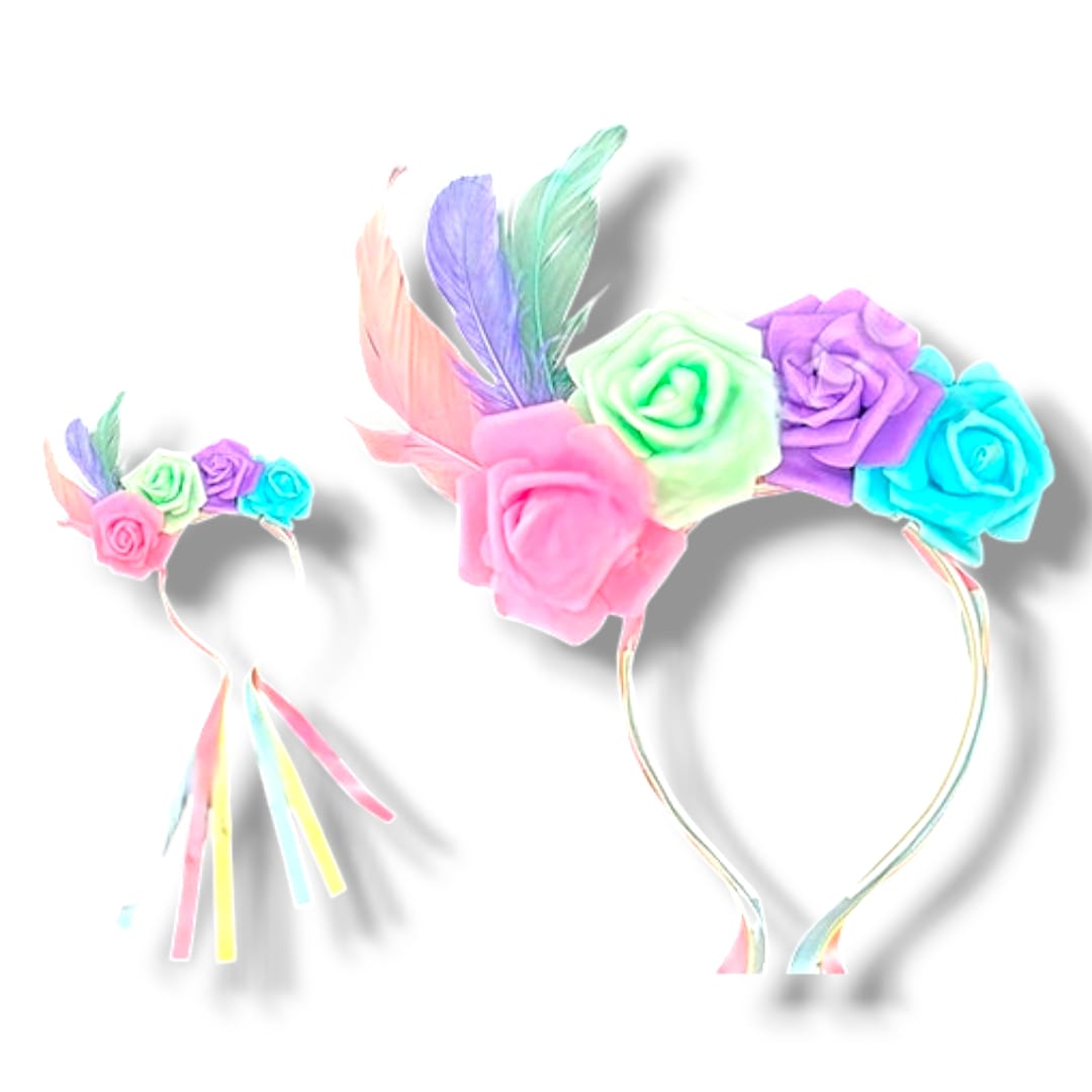VINCHA FLORES PASTEL MULTICOLOR CON PLUMA